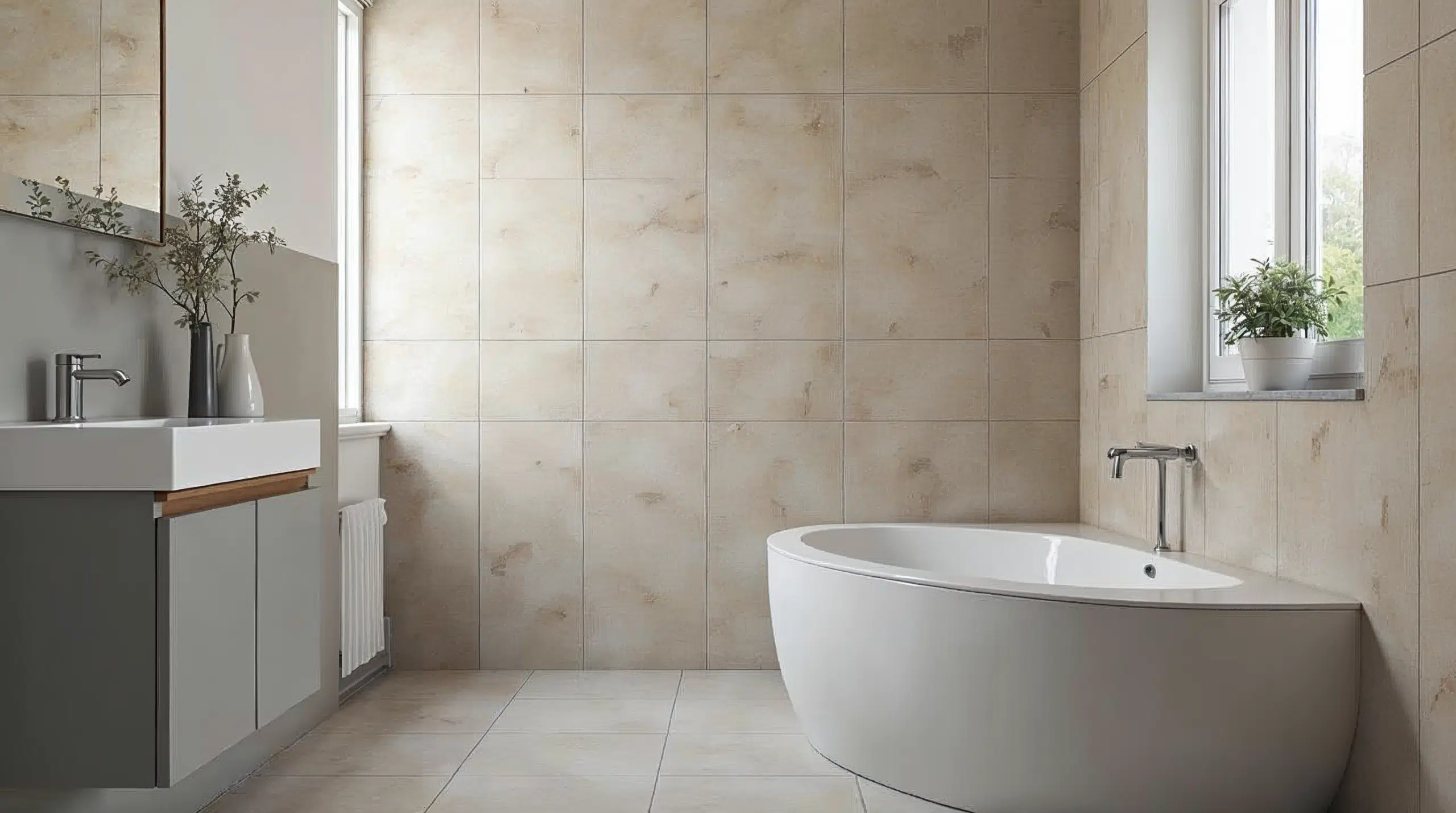 - Großes Format: Große Fliesen (60 x 60 cm oder größer) wirken modern und reduzieren Fugen.